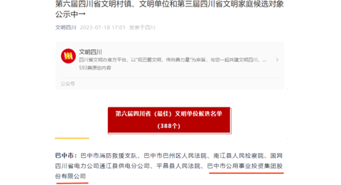 巴中市公用事业投资集团股份有限公司认真践行社会主义核心价值观,推动精神文明建设与生产经营、党的建设融合发展,2023年6月,通过四川省文明办测评组考核验收,成功列入第六届四川省最佳文明单位推荐名单。