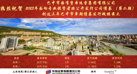 2023年7月21日,巴中市国有资产投资有限责任公司成功发行2023年四川省城乡基础设施建设专项债券11000万元,用途为国道244线、347线、542线巴城过境公路项目,债券期限20年,债券利率:3.11%/年。
