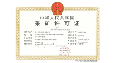 2023年11月9日,金鑫矿业公司子企业巴中邦圣新材料有限公司完成南江县坪河镇甘树坪花岗岩矿1亿元采矿权出让价款缴纳并取得采矿权证,该矿权现有资源储量464.7万m³,可年产16.67万m³饰面用花岗岩矿。