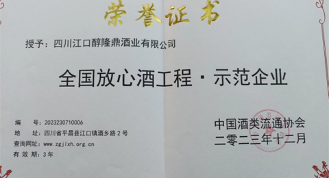 2023年12月,四川江口醇隆鼎酒业有限公司被中国酒类流通协会授予“全国放心酒工程·示范企业”。